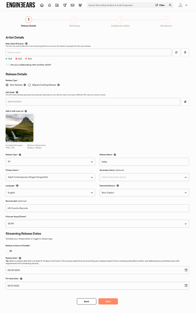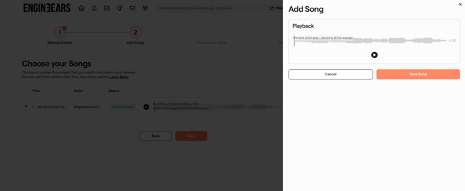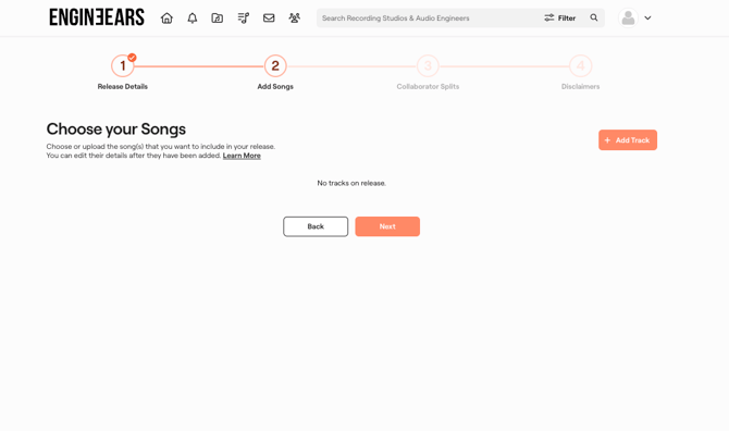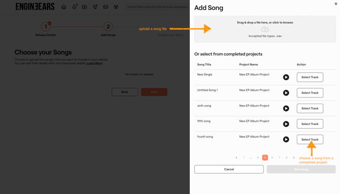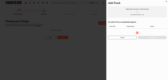 • Select from Completed Projects: Browse through your completed projects (if any) to select one or more songs from any projects you have completed on the EngineEars platform. The final asset files and song details from the completed project will used in the release, you have the option to make changes to the track details after selecting the song.