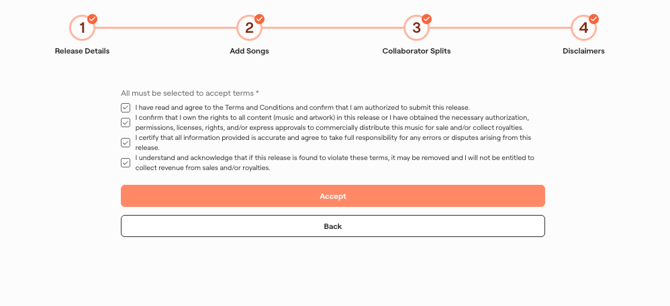 9. Disclaimers: Carefully read, review and agree to the terms in order to submit your release. You must accept all the terms in order to proceed with release submission. If you exit the release submission process without accepting the terms, your release is saved as a 'draft' but is not submitted for release.