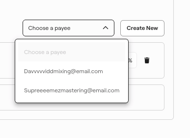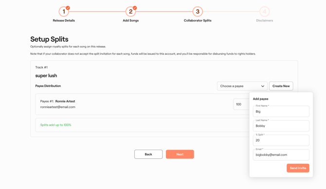 Or click the "Choose a payee" dropdown to select a previously invited collaborator to add to a song split.