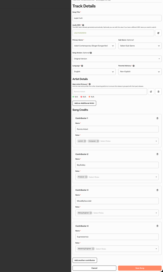 • Song Credits Contributors: Add one or more contributor(s) to your song's credits.