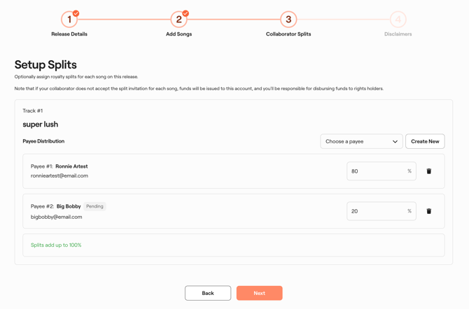 Once you're done adding collaborator splits for your song(s), click "Next" to proceed to the next step.