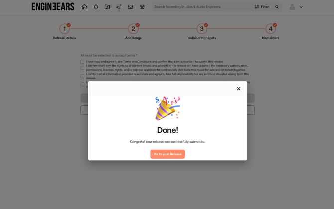 • If your invited collaborator does not accept the split invitation for each invited song, funds will be issued to the EngineEars account of the user who submitted the release, and they will be responsible for disbursing funds to rights holders.