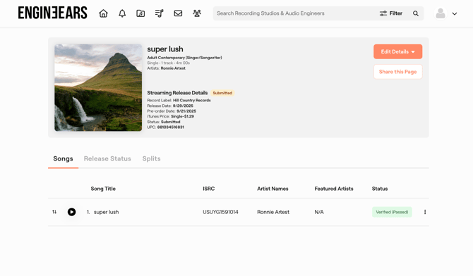 Click the Edit button on each row to view and edit the track's details. You have the option to either enter or update the details for each song included in the release. Click "Save Song" after editing the details for a song.