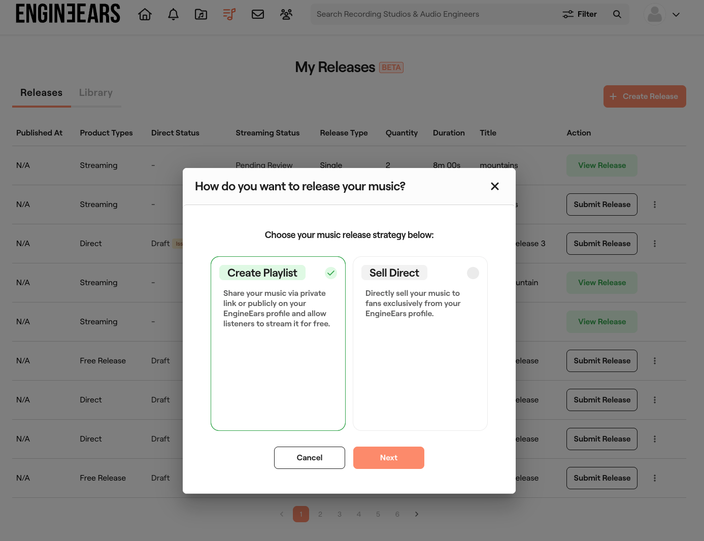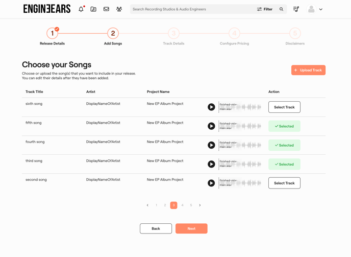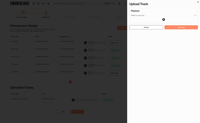 - Select Track: Browse through your completed projects (if any) to select one or more songs from any projects you have completed on the EngineEars platform. The final asset files and song details from the completed project will be submitted for the release.