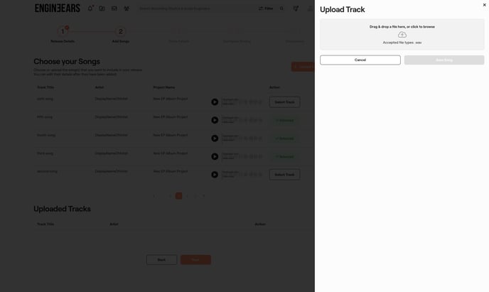 6. Add Songs: upload one or more new song files or choose existing song files to include in your release. You can create a release that has a combination of uploaded tracks and selected tracks.
