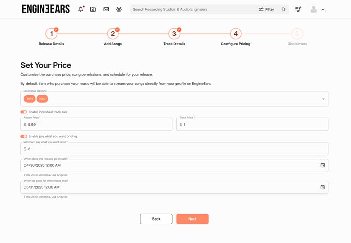 8. Configure Pricing: Customize the price, song permissions, and sales schedule for your release.