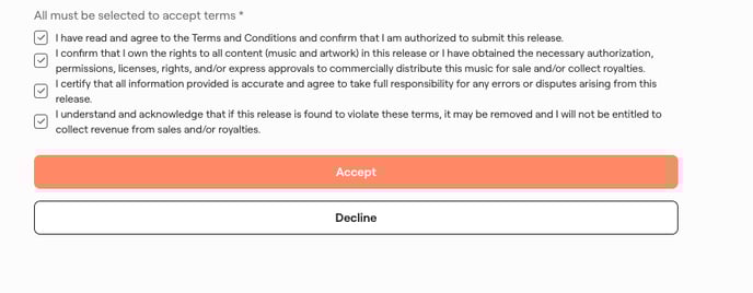 9. Disclaimers: Carefully read, review and agree to the terms in order to submit your release. If you decline, your release is saved as a 'draft' but is not submitted for release to your Artist Profile. You must accept all the terms in order to proceed with release submission.