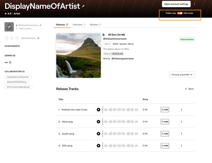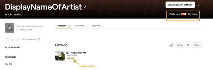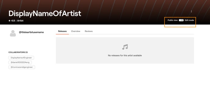 3. To preview how releases appear on your public Artist Profile to visiting fans, click "Edit Mode" toggle to OFF so that you switch to "Public View" ON. This allows you to view your Artist Profile from the perspective of fans and listeners.