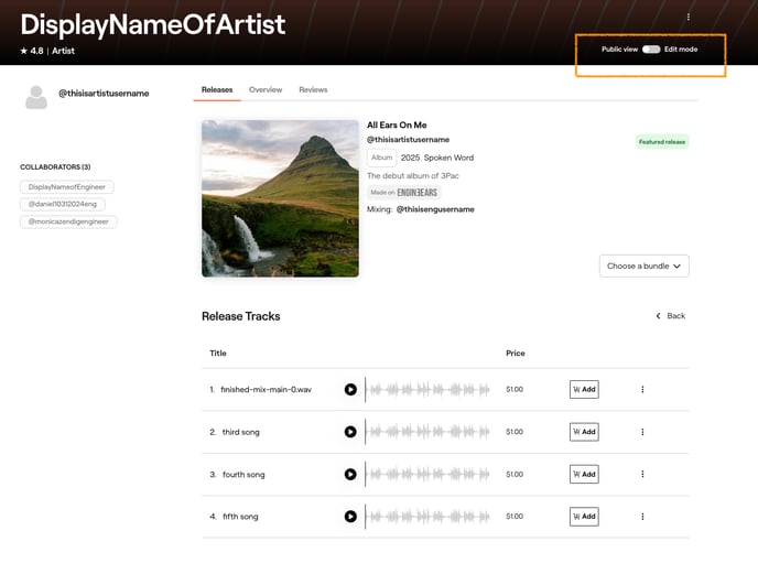 4. You can also click into a particular release to preview its details, such as the pricing set for the album, individual tracks, ordering, and streaming playback. You can toggle between "Edit Mode" ON/OFF and "Public View" ON/OFF to compare how fans experience this release on your profile.