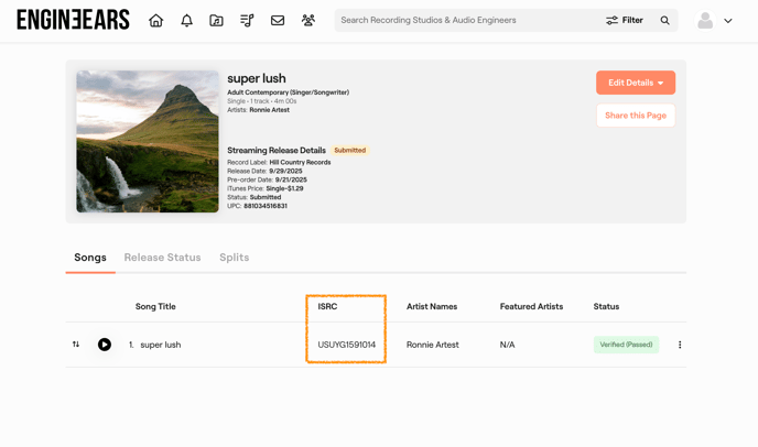 4. On the Release Details page, locate the song within the release, then you can find the ISRC for the track.