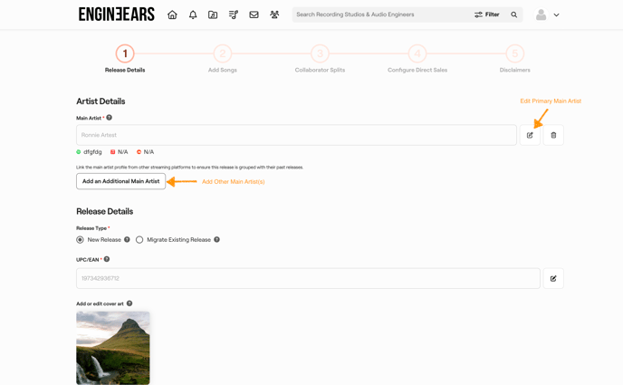 Click the edit icon (pencil) to edit the primary main artist for the release.
