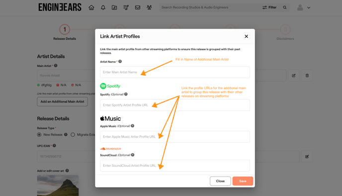 - Additional Main Artist (optional): If there is more than one main artist associated with this release, you can include additional main artists, up to 4. You can optionally enter their artist profile URLs (from Spotify, Apple Music, SoundCloud) to link their artist profile to these streaming platforms to ensure this release is grouped with their past releases. If the additional main artist doesn't have a profile yet on these streaming platforms, leave blank and new artist profiles will be auto-created upon release.