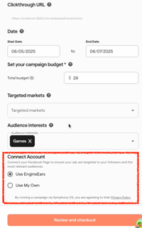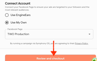 15. You Facebook Page has now been successfully connected to your EngineEars account and granted permissions to run ad campaigns. Follow these steps to configure your ad campaign to promote your services, or to promote your release. The Review and Checkout button will be enabled, click on it to proceed with payment and starting your ad campaign.