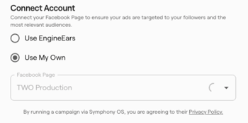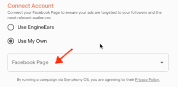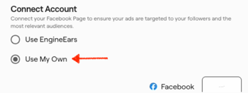 Note: When Use EngineEars is selected, the EngineEars default Facebook Page will be connected and used for your ad campaign. To further customize your ad campaign's targeting to narrow in on your specific followers, fans and related audiences, select Use My Own.