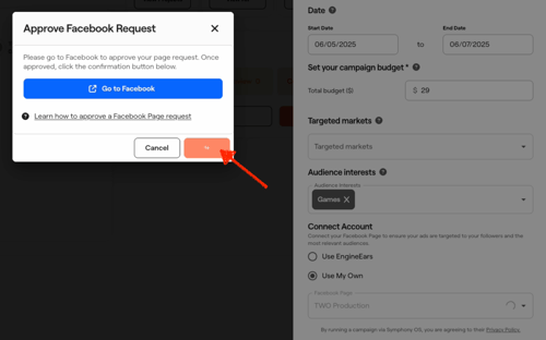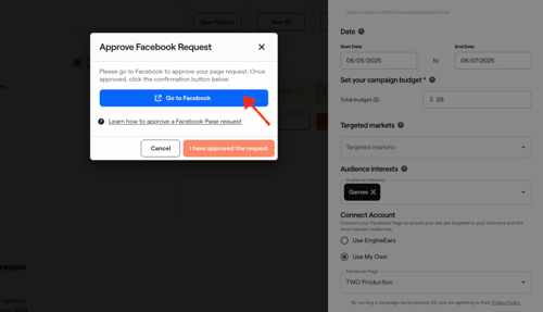 6. Once your Facebook Page is selected in the dropdown, it will trigger an Approve Facebook Request. Click the Go to Facebook button.