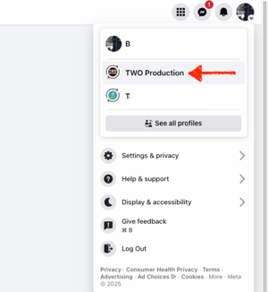 7. This will open up Facebook in a new browser tab. Click your profile dropdown (top-right), and locate the name of your Facebook Page you want to switch into, then click on it.