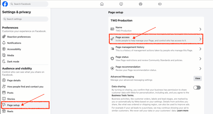 10. Once within your Facebook Page settings, click Page Setup, and then click Page Access