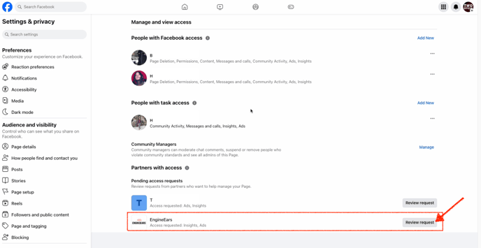 11. Locate the Partners with access section, and you will see a pending access request from EngineEars. Click the Review Request button