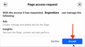 Note: EngineEars needs to request access to both Insights and Ads in order to effectively target ad campaigns on your Facebook Page's behalf and also to provide metrics on your campaign's performance.
