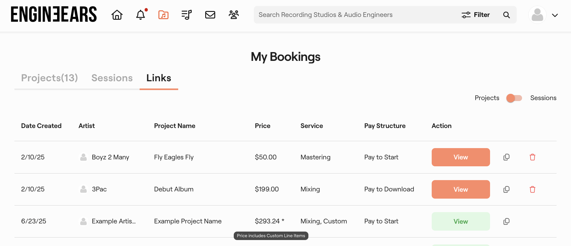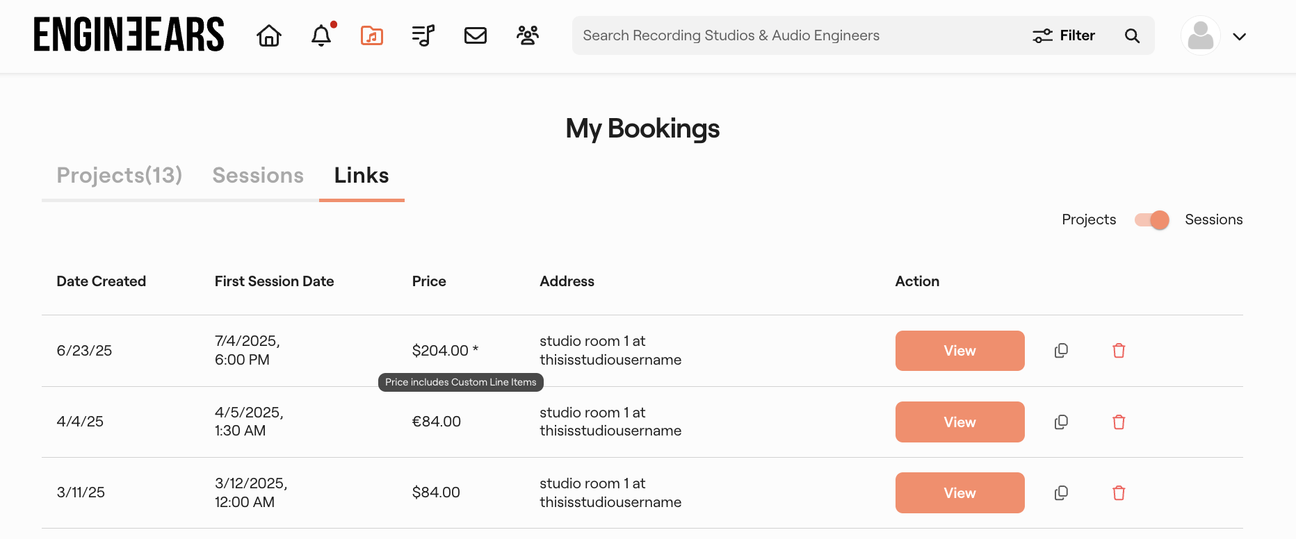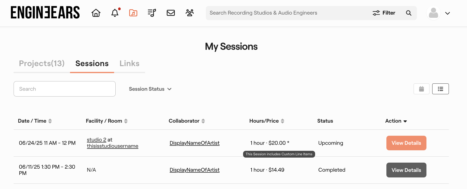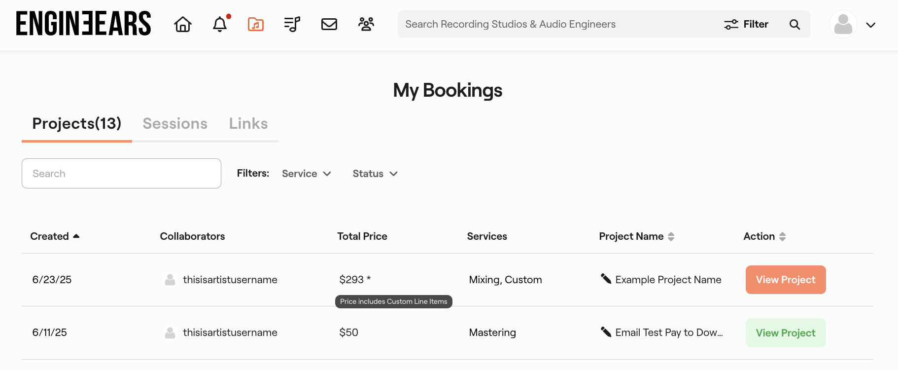 For Projects/Sessions where custom line items have been added, the price will be designated with an * character in the table on the My Bookings page. When you mouse over the price with the * character on it (when using a computer, not from a mobile device), you can see that the booking's price includes custom line item(s).