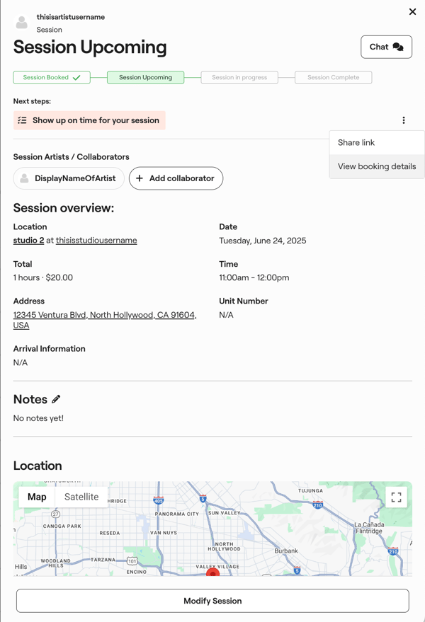 To view the custom line item details from within the Session Overview, you can click the 3-dot Options menu, and then select the "View Booking Details" option.