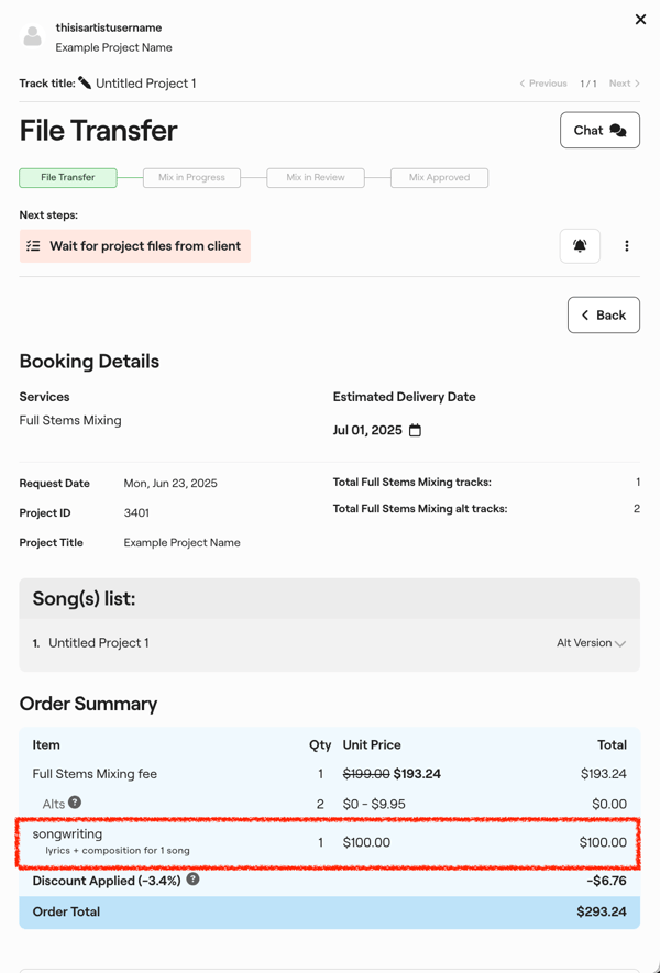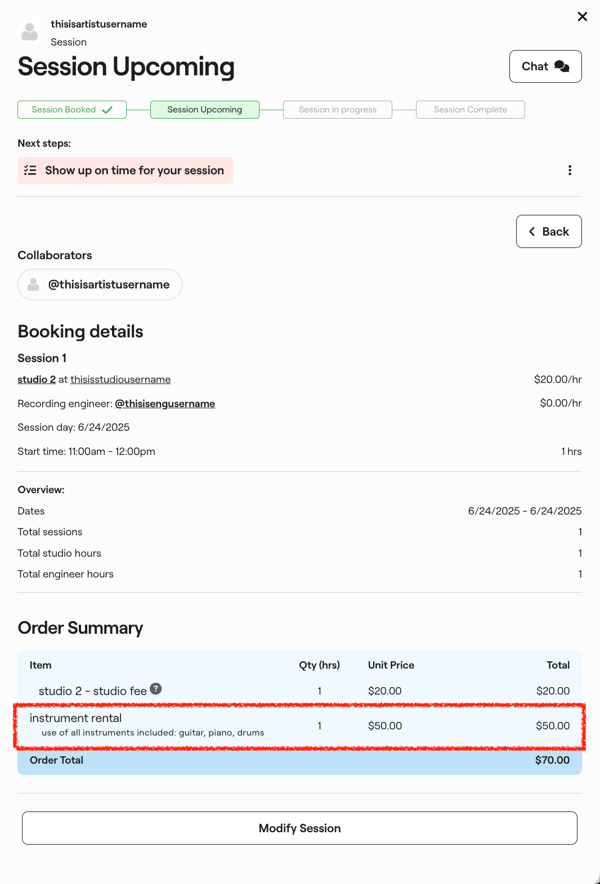 After a project/session booking has been created with custom line item(s) added, you can view and refer to the details of the custom line item(s) for the booking.