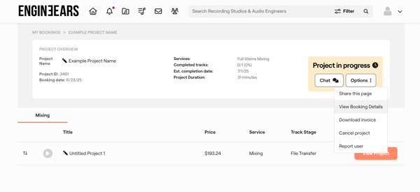 To view the custom line item details from within the Project Overview, you can click the 3-dot Options menu, and then select the "View Booking Details" option.
