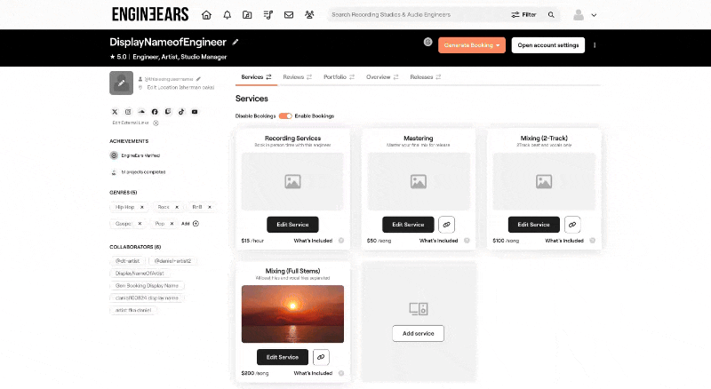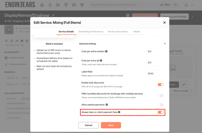 This option will charge the fees to the Engineer's payout for the service instead of charging the artist at checkout, resulting in the Order Total being the same as the listed price for the service.