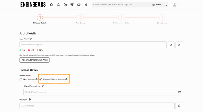 - Migrate Existing Release: This is an existing release that has previously been distributed to streaming services and digital stores before. By specifying the Original Release Date, UPC/EAN, ISRC codes, and keeping all the uploaded audio files and metadata exactly the same, streaming platforms and stores will consider this upload to be the same release.