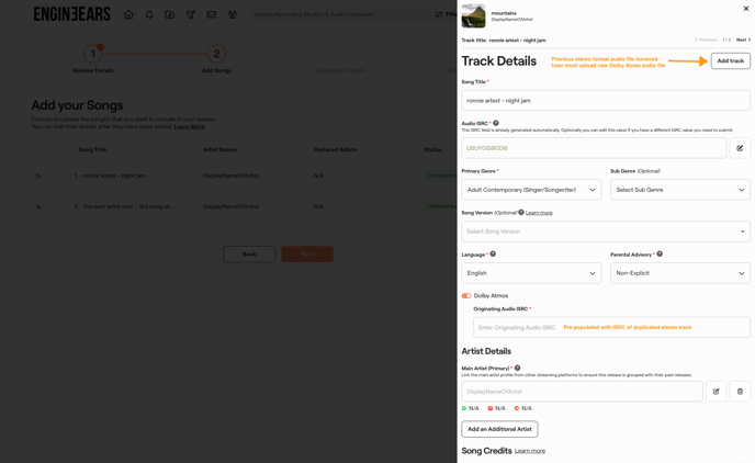 Note: This does not override the stereo file format of your previously submitted tracks, rather, it allows you to upload an additional Dolby Atmos file format in a separate identical Dolby release to accompany the stereo format of your submitted track (while maintaining all other metadata details of the song identical).