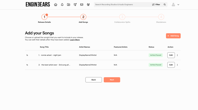 4. In the Add Songs (Step 2) screen, confirm the duplicated tracks for your Dolby Atmos release.