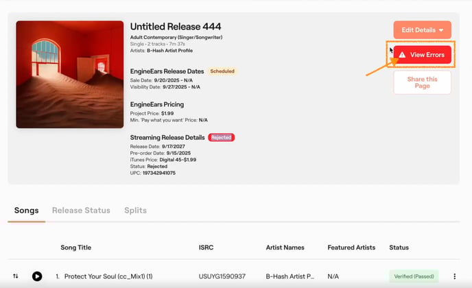 3. Click on the "View Errors" button to see the reason(s) your release was rejected during the Content Review process.