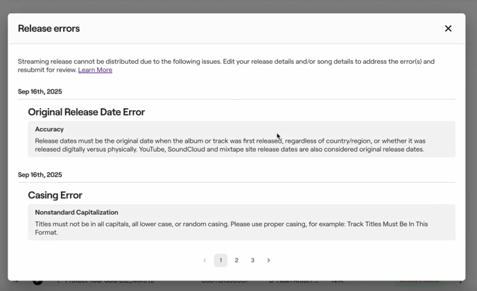 Most often, these issues are flagged during the review process before your release is sent to streaming services and stores. Occasionally, your release might be flagged by specific streaming services and/or stores after your release is sent to them for release distribution (it is possible that your release can be flagged even after it is released live).